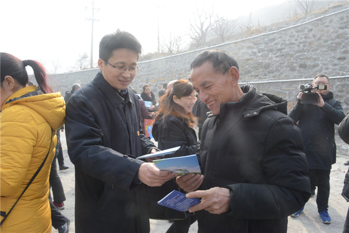 志愿者为大石岩村群众分发文明风尚宣传册。