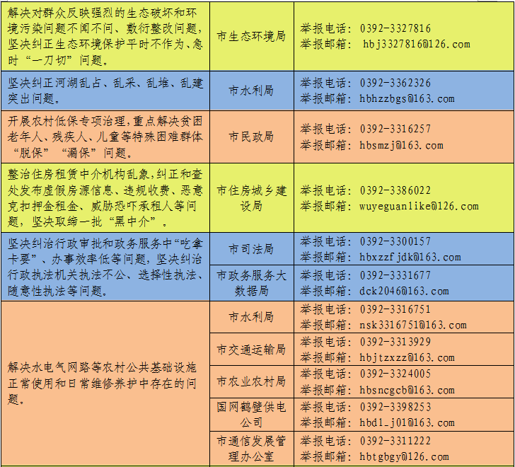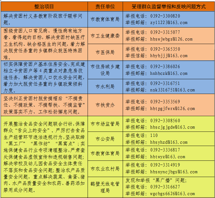 按照中央纪委国家监委、省纪委监委统一部署和市委关于在“不忘初心、牢记使命”主题教育中开展专项整治的要求,近日,中共鹤壁市委主题教育领导小组、中共鹤壁市纪委、鹤壁市监委印发了《专项整治漠视侵害群众利益问题部门联动整改实施方案》,部署开展了由市纪委监委牵头、相关市直单位为责任单位,针对4个方面14项突出问题的专项整治工作。此次专项整治聚焦扶贫领域腐败和作风问题,聚焦教育医疗、环境保护、食品药品安全等民生领域侵害群众利益问题,聚焦发生在群众身边的不正之风和“微腐败”问题,聚焦统计造假问题,着力解决群众最关心最直接最现实的利益问题,不断增强人民群众的获得感、幸福感、安全感。为方便群众参与监督和反映问题,现将专项整治受理群众监督举报和反映问题方式公布如下。