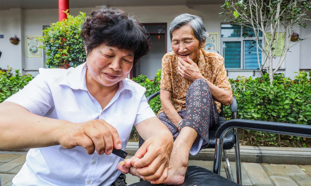 女儿为年迈的父亲剪指甲,陪老人度过一个愉快的重阳节。(获嘉县纪委监委 郭爱民 摄)