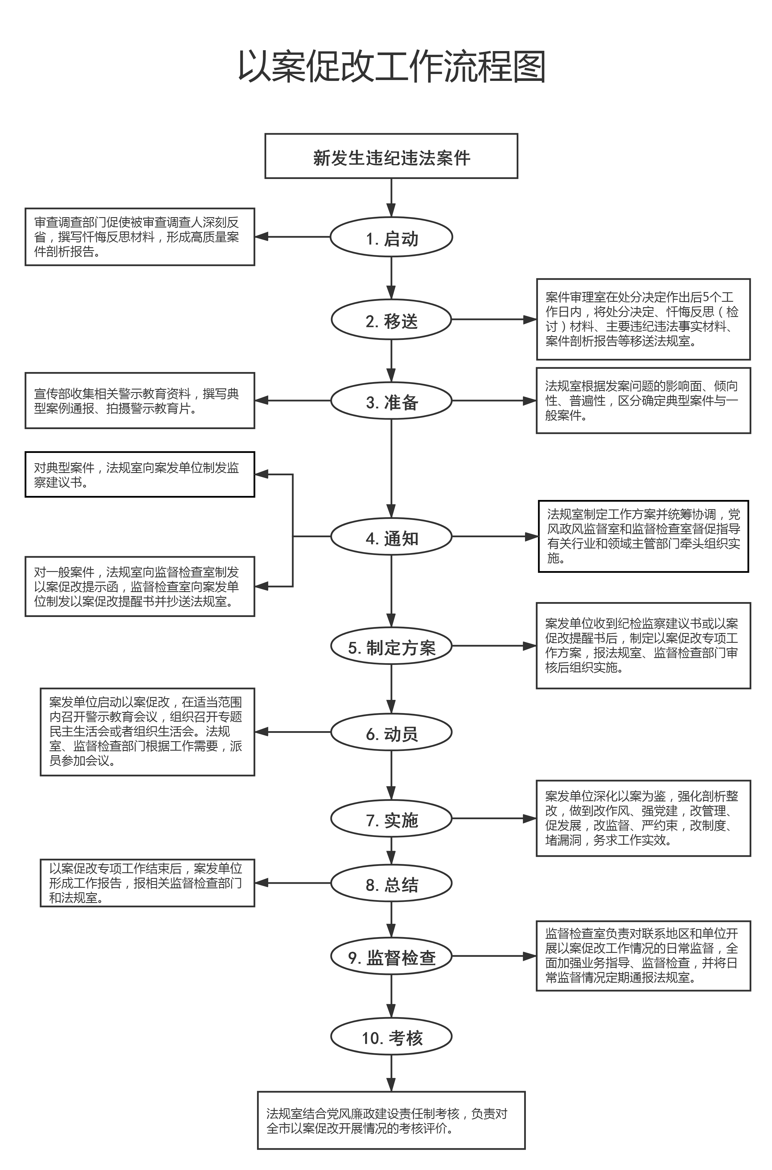 细化工作流程,规范操作。《工作流程》以有效衔接贯通、运转高效为重点,从案件的启动到最后的考评,明确“十步工作法”,将以案促改工作规范化制度化,使工作程序更加具体,任务更加明确,操作更加方便,初步形成以案促改工作常态化运行机制。