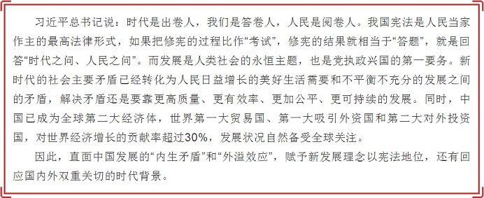 “法与时转则治,治与世宜则有功。”第十三届全国人民代表大会审议第一次会议通过宪法修正案,我国宪法又迎来一次完善和升华。“贯彻新发展理念”首次写入国家根本法。那么,什么是“新发展理念”,为什么要入宪,此举有什么重大和深远的意义?小栋今天带你一起好好学习。