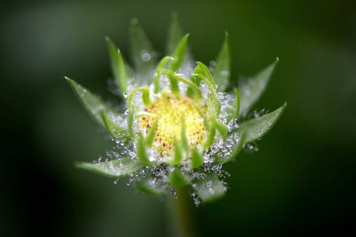 绿叶黄花间,珠露点点,欲凝成霜,犹如星空璀璨的繁星,晶莹明亮。