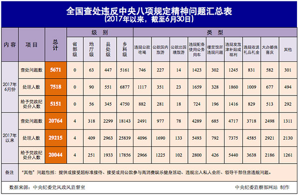 为掌握全国贯彻落实中央八项规定精神情况,中央纪委在31个省区市和新疆生产建设兵团、139个中央和国家机关、102个中央企业、15个中央金融企业建立了落实中央八项规定精神情况月报制度。2017年以来,截至6月30日,全国查处违反中央八项规定精神问题情况如下:
