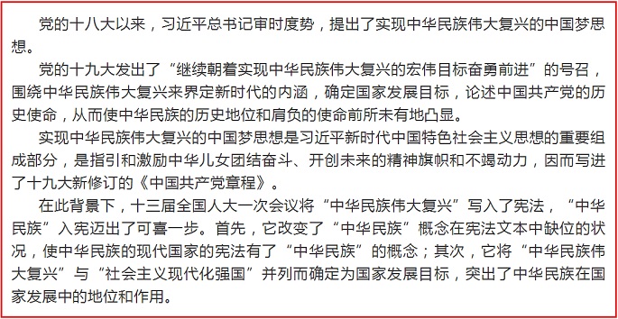 2018年3月11日,十三届全国人大一次会议通过了《中华人民共和国宪法修正案》。从此,宪法序言第七和第十自然段增加了“中华民族伟大复兴”的内容。这是“中华民族”首次写入宪法,具有里程碑式的意义。
