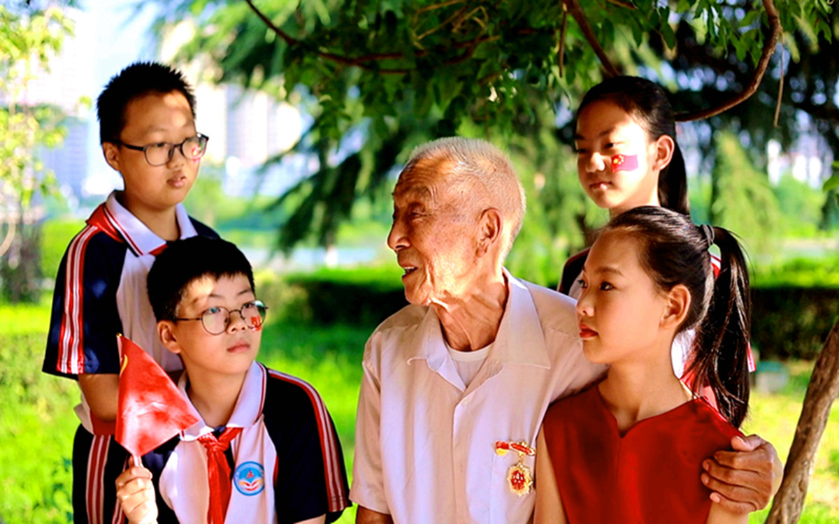 洛阳市宜阳县滨河公园内,老党员带领孩童们忆峥嵘岁月,传革命薪火,激励少年珍惜美好生活,争做新时代奋斗者、追梦人。(宜阳县纪委监委 布书国 摄)