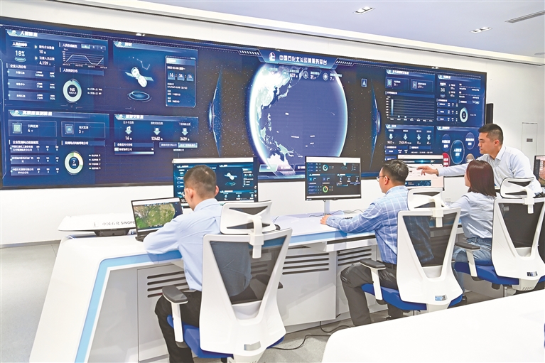 中国石化集团北斗运营服务中心的技术人员正在基地内对北斗高精度监测平台进行监控。该平台通过北斗卫星导航系统,为中国石化上中下游全产业链提供全天候、全天时的高精度定位、导航、授时和短报文通信服务。图片来源:视觉中国
