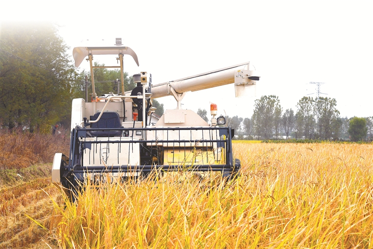 江苏省镇江市镇江新区姚桥镇农田里,一台无人驾驶收割机正在作业。这台无人驾驶收割机连接了北斗卫星导航系统,能够以螺旋形路线,自动将田里的水稻收割干净。图片来源:视觉中国