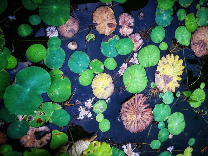 暑去秋来风微凉,荷叶渐残,满池风景尽显秋色。