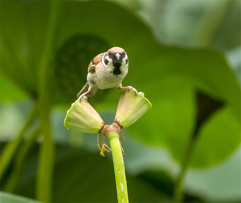 池上秋又来,荷花半成子。莲蓬在秋风中翘首摇曳,引得鸟儿前来嬉戏,一赏秋景。
