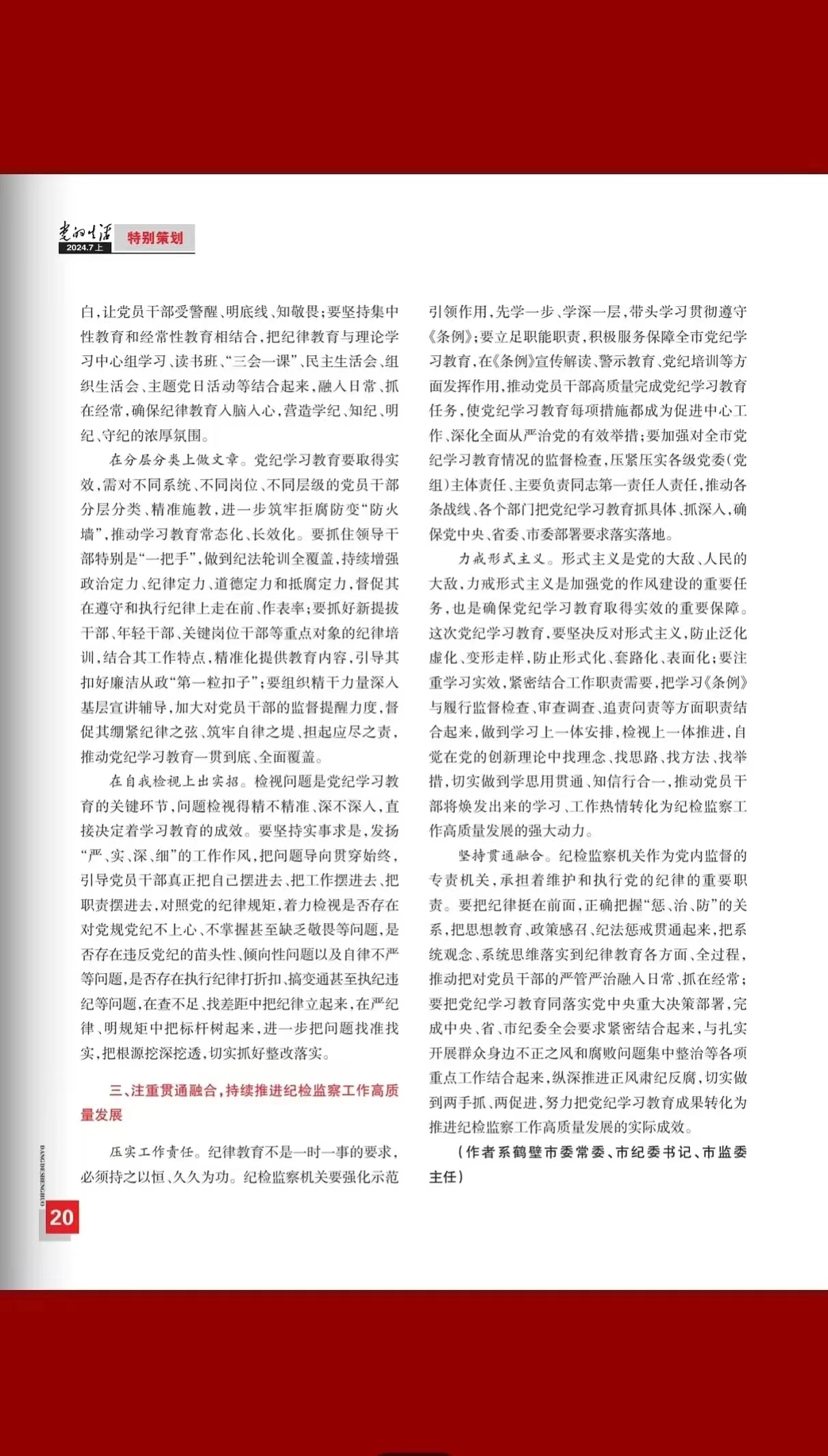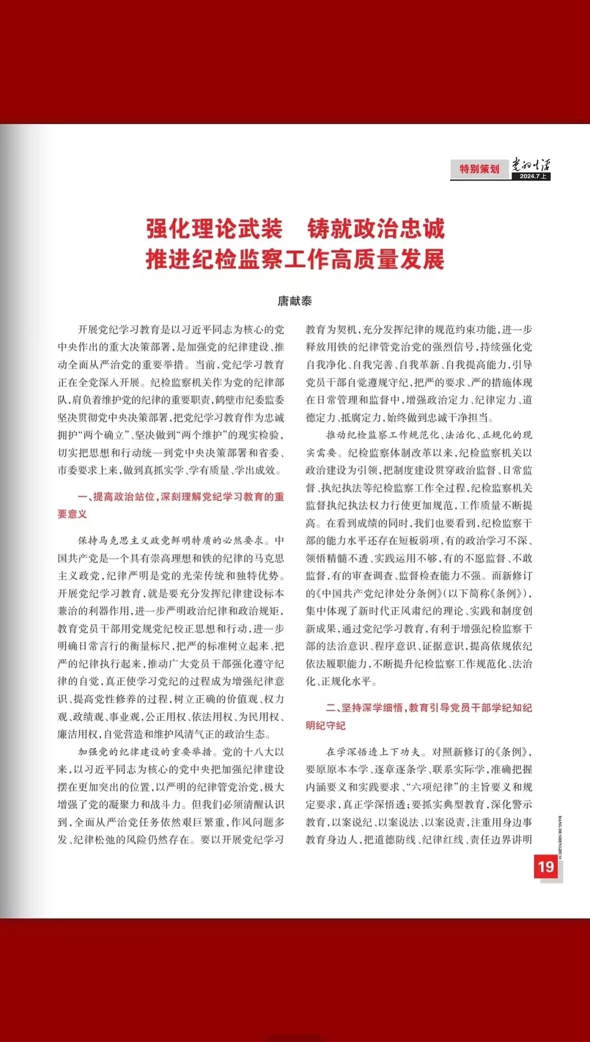 2024年第7期(上)《党的生活》杂志刊发鹤壁市委常委、市纪委书记、市监委主任唐献泰署名文章《强化理论武装 铸就政治忠诚 推进纪检监察工作高质量发展》。
