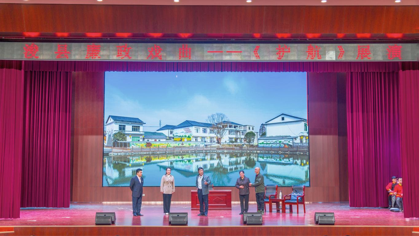 廉政戏曲《护航》以灾后重建工作中发生在群众身边的腐败问题典型案例为蓝本,讲述了一名返乡创业、带领群众脱贫致富的“明星”村委会主任,没有抵住亲情压力,为其母亲和哥哥违规谋取国家补偿金“开绿灯”,随后在该县纪检监察干部的耐心开导和教育下,最终幡然悔悟,退还违规所得的故事。该戏曲在赢得了满堂喝彩的同时,丰富曲折的故事情节也成功展现了纪检监察机关坚持“惩前毖后、治病救人”方针的形象。现场观看的党员干部一致表示,该剧寓“廉”于“戏”、以“戏”化人,是一堂直抵人心的廉政教育课。