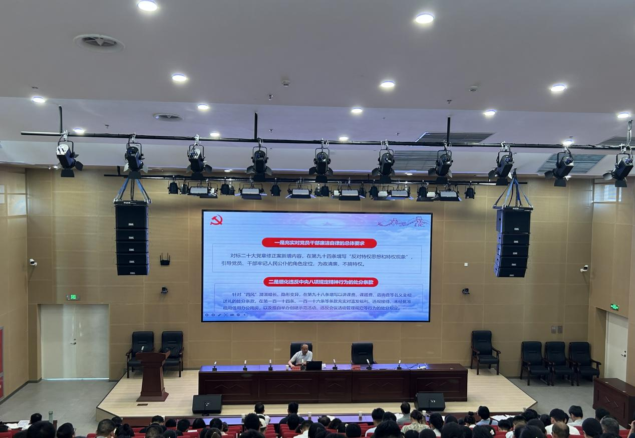 5月21日下午,河南信息科技学院在报告厅举办“凝心聚力 蓄势待发”教师专题培训第六讲,邀请市纪委监委法规室主任、四级高级监察官李长海围绕《中国共产党纪律处分条例》开展专题讲座,筹建处全体党员、学生党员代表参加培训。