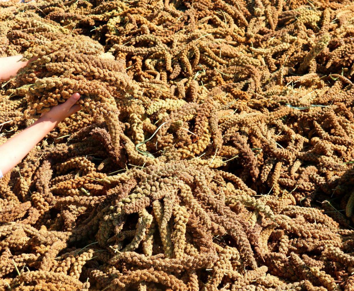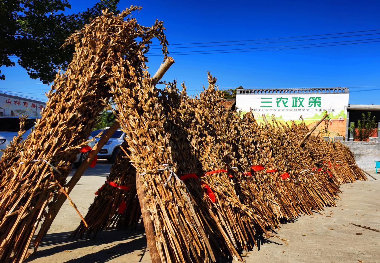 红色的绳子代表着丰收,经过暴晒的芝麻杆全都变得金灿灿的,系着红绳等待着属于它们的二次采摘。