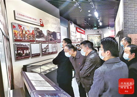 湖北省武汉市武昌区纪委监委近日组织党员干部到中国共产党纪律建设历史陈列馆开展党史学习教育。图为该区党员干部观看“三湾改编与三大纪律六项注意”展品。李国涛 摄