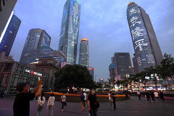 近日,江苏南京新街口建筑亮灯缅怀袁隆平院士。(图片来源:视觉中国)