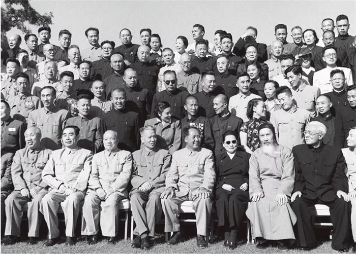 中华人民共和国第一届全国人民代表大会第一次会议全体代表于1954年9月21日合影。毛泽东主席和代表们在一起。前排左起:董必武、周恩来、李济深、刘少奇、毛泽东、宋庆龄、张澜、林伯渠。新华社稿 侯波/摄