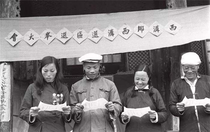 山西省平顺县西沟乡西沟区在1953年9月27日举行选举大会。全国著名农业劳动模范李顺达、申纪兰被选为西沟乡人民代表大会的代表。图为在西沟区选举大会上被选为代表的(自左起)申纪兰、李顺达、韩春兰和张秋全在观看当选证书的情形。新华社记者 项化庚/摄