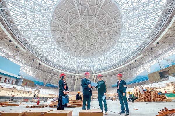 图为浙江省杭州市纪检监察干部在杭州亚运会自行车馆建设工地走访,了解项目建设相关情况。鲍宇晗 摄