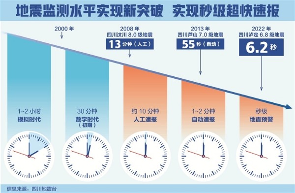 近年来,我国地震预警信息产出速度不断提升,从约10分钟的人工速报到1至2分钟的自动速报,再到秒级的地震预警,为抗震救灾提供了强大科技助力。(制图:张寒)