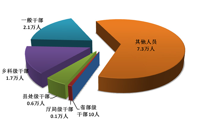 2019年第一季度,全国纪检监察机关共接受信访举报75.2万件次,处置问题线索36.4万件,谈话函询7.2万件次,立案13.8万件,处分11.7万人(其中党纪处分9.8万人)。处分省部级干部10人,厅局级干部0.1万人,县处级干部0.6万人,乡科级干部1.7万人,一般干部2.1万人,农村、企业等其他人员7.3万人。