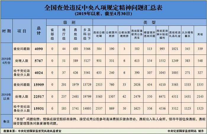 为掌握全国贯彻落实中央八项规定精神情况,中央纪委在各省区市和新疆生产建设兵团、各中央和国家机关、各中央企业和中央金融企业等建立了落实中央八项规定精神情况月报制度。2019年以来,截至4月30日,全国查处违反中央八项规定精神问题情况如下: