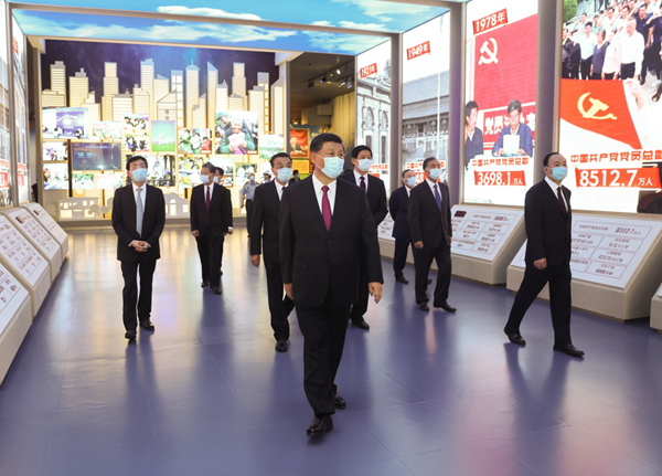 气势磅礴的长城主题漆画、马克思《布鲁塞尔笔记》第四笔记本手稿、一大会址复原场景、革命根据地的创建展板、遵义会议复原景观、党的七大投票箱、开国大典影像、抗美援朝战争中使用过的武器、《解放思想,实事求是,团结一致向前看》讲话提纲、创办经济特区图片、脱贫攻坚数据图表、火神山雷神山医院模型……珍贵的文物实物、翔实的档案资料、生动的图片视频、逼真的复原景观,吸引了习近平等领导同志的目光。他们不时停下脚步仔细观看,认真听取讲解,详细询问有关情况。