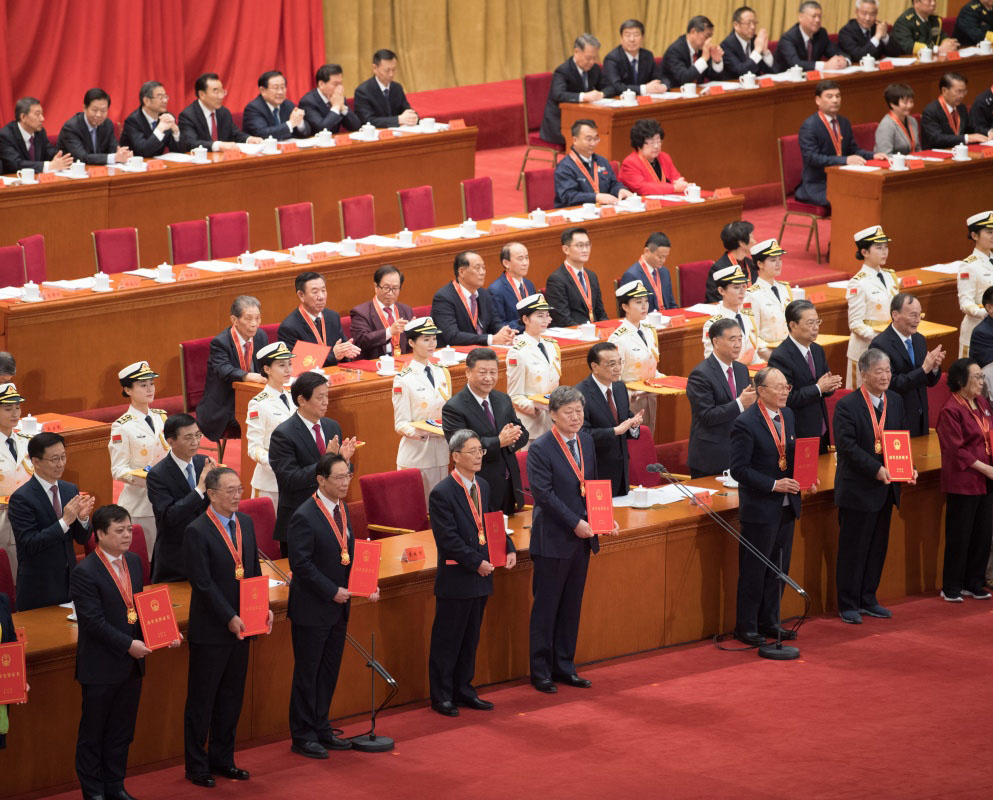 在《春天的故事》乐曲声中,习近平等为获得改革先锋称号、中国改革友谊奖章人员代表颁奖。