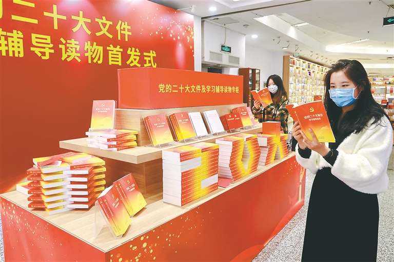10月28日,北京图书大厦,读者在翻阅党的二十大文件及学习辅导读物。(图片来源:人民视觉)