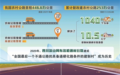 数据显示,截至2021年底,我国农村公路里程446.6万公里,是高铁里程的100余倍、高速公路里程的27倍。党的十八大以来,累计新改建农村公路253万公里,解决了1040个乡镇、10.5万个建制村通硬化路难题。遍布中国乡村的农村公路连接绿水青山,连通党心民心,不仅让农民的钱袋子鼓起来,更串联起人民对美好生活的向往。