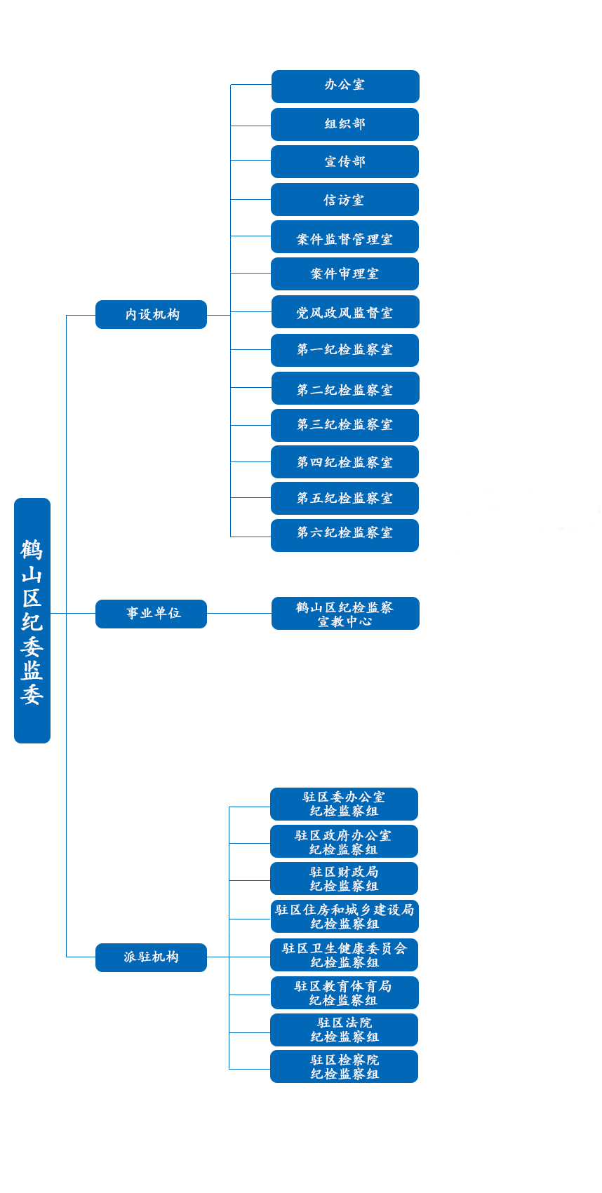 鹤山区纪委机关和鹤山区监委合署办公,共有13个内设机构,分别为:办公室、组织部、宣传部、信访室、案件监督管理室、案件审理室、党风政风监督室、第一至第六纪检监察室。下属1个事业单位:鹤山区纪检监察宣教中心。实行统一管理的派驻机构8个,分别为:鹤山区纪委监委派驻区委办公室纪检监察组、鹤山区纪委监委派驻区政府办公室纪检监察组、鹤山区纪委监委派驻区财政局纪检监察组、鹤山区纪委监委派驻区住房和城乡建设局纪检监察组、鹤山区纪委监委派驻区卫生健康委员会纪检监察组、鹤山区纪委监委派驻区教育体育局纪检监察组、鹤山区纪委监委派驻区法院纪检监察组、鹤山区纪委监委派驻区检察院纪检监察组。