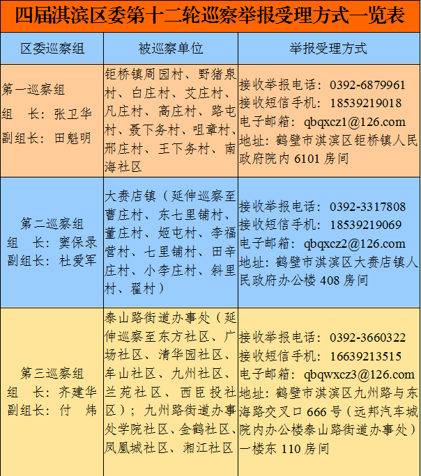 1月19日起,鹤壁市淇滨区委3个巡察组分别对泰山路街道及7个社区、九州路街道4个社区、大赉店镇及10个行政村、钜桥镇11个行政村、1个社区党组织开展巡察。