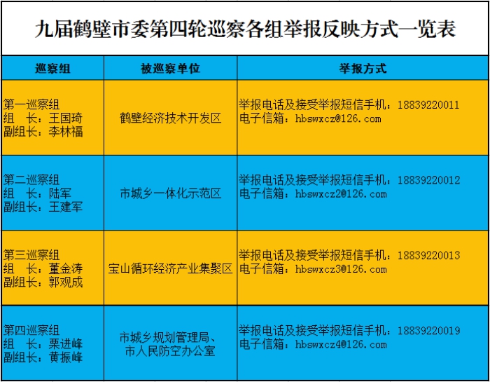 经市委研究决定,2018年4月12日起,九届市委第四轮四个巡察组分别对鹤壁经济技术开发区、市城乡一体化示范区、宝山循环经济产业集聚区、市城乡规划管理局、市人民防空办公室等5家单位党工委(工委、党组)开展巡察工作。