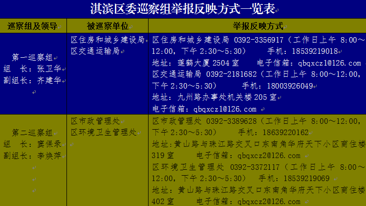 根据巡察工作职责,区委巡察组主要受理对上述单位领导班子及其成员、内设科室及二级机构主要负责人的举报和反映。其他不属于巡察受理范围的信访问题,按有关规定处理。(淇滨区纪委)