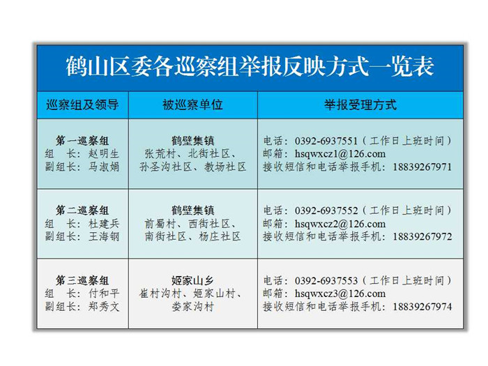 8月19日起,鹤山区委3个巡察组分别对鹤壁集镇张荒村、前蜀村、北街社区、孙圣沟社区、教场社区、西街社区、南街社区、杨庄社区和姬家山乡崔村沟村、姬家山村、娄家沟村,开展为期40天的巡察。