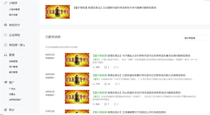 借讲法访廉提认识。纪检监察干部全员行动,深入村居宣讲《监察法》、《纪律处分条例》等法律法规,以案为鉴,开展警示教育;带着问题入户走访,有针对性的约谈提醒村“两委”干部,防病于未然。目前,已开展宣讲76场次,受教育1300余人,约谈村居“两委”干部253人。借微信平台抓教育。在“清风浚县”微信公众号上开通《警示零距离》栏目,深入剖析发生在身边的典型案例,教育党员干部守法纪、知敬畏;通过微信群,每天向党员干部发送“廉言晨习”,做到教育不间断,警钟长鸣。目前,已通报典型案例32期,发送“廉言晨习”147期。借现场庭审强震慑。与县人民法院协作建立常态化庭审现场警示教育制度,根据案件性质和犯罪嫌疑人特点,有针对性地组织党员干部旁听庭审,加强震慑,净化心灵。
