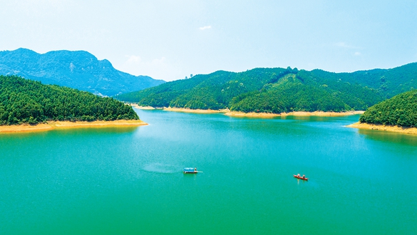 保护生态文明,建设美丽中国,要严守生态保护红线、环境质量底线、资源利用上线三条红线。近年来,江西省吉安市峡江县积极践行“生态优先、绿色发展”理念,大力推行河湖长制,实施山水林河湖综合治理,加强水资源和湿地保护,持续提升了人居环境和生态涵养能力,推动生态文明与经济建设协调发展。图为保洁员在峡江县金江乡万宝水库水面巡查。(图片来源:视觉中国)
