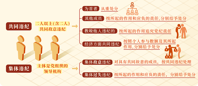 与共同违纪不同,集体违纪的主体是党组织的领导机构。集体违纪包括集体故意违纪和集体过失违纪两种情况。党组织领导机构集体作出违犯党纪的决定或者实施其他违犯党纪的行为,对具有共同故意的成员,按共同违纪处理;对过失违纪的成员,按照各自在集体违纪中所起的作用和应负的责任分别给予处分。