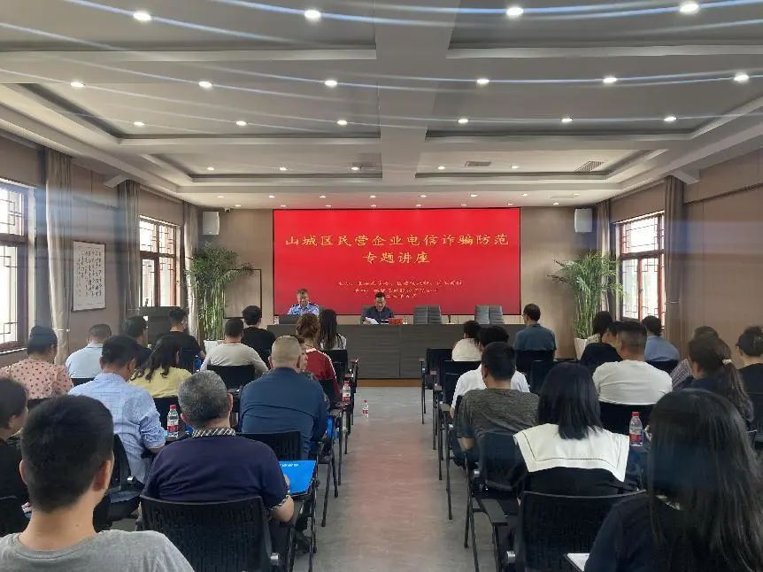 为增强民营企业电信诈骗防范能力,切实保护辖区企业、员工财产安全,5月18日下午,鹤壁市开展了电信诈骗防范专题讲座,讲座由山城区主办,47家民营企业经理人参加。活动邀请了全省“优秀人民警察”荣誉称号、河南“十大忠诚卫士”提名奖获得者,河南省首批打击电信诈骗特聘专家,鹤壁市公安局网安支队支队长、一级警督孙培新作专题授课。