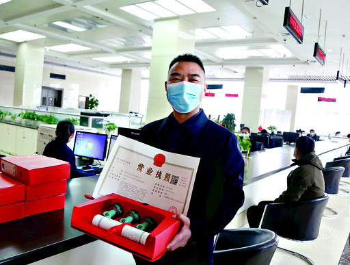 左图为万修江展示刚刚领到的营业执照和鹤壁市优化营商环境开办企业大礼包。本报记者 王峥 摄