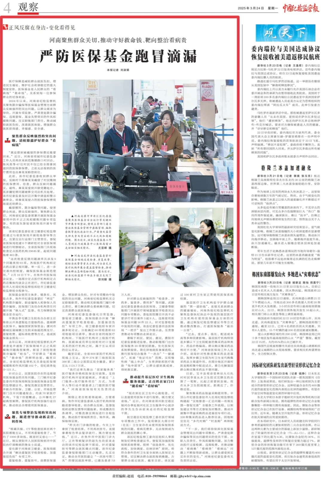 3月24日,中国纪检监察报专版刊发《河南聚焦群众关切,推动守好救命钱、靶向整治看病贵 严防医保基金跑冒滴漏》,报道河南纪检监察机关严肃查处欺诈骗保、违规套保、基金失管背后的作风和腐败问题,压实职能部门责任,推动减轻就医负担、改善就医体验,增强群众就医获得感、幸福感、安全感的生动实践。