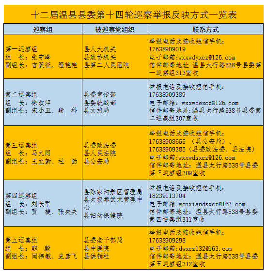 巡察期间,县委各巡察组均开通信件邮寄地址、专门举报电话、电子邮箱,受理信访举报的时间为工作日工作时间,巡察结束后信访渠道自行关闭。按照干部管理权限,各巡察组主要受理反映该单位领导班子及其成员和重要岗位负责人问题的来信来电来访。对其他与巡察工作无直接关系的个人诉求、涉法涉诉等信访问题,将按照分级负责、属地管理原则,转交有关单位办理。