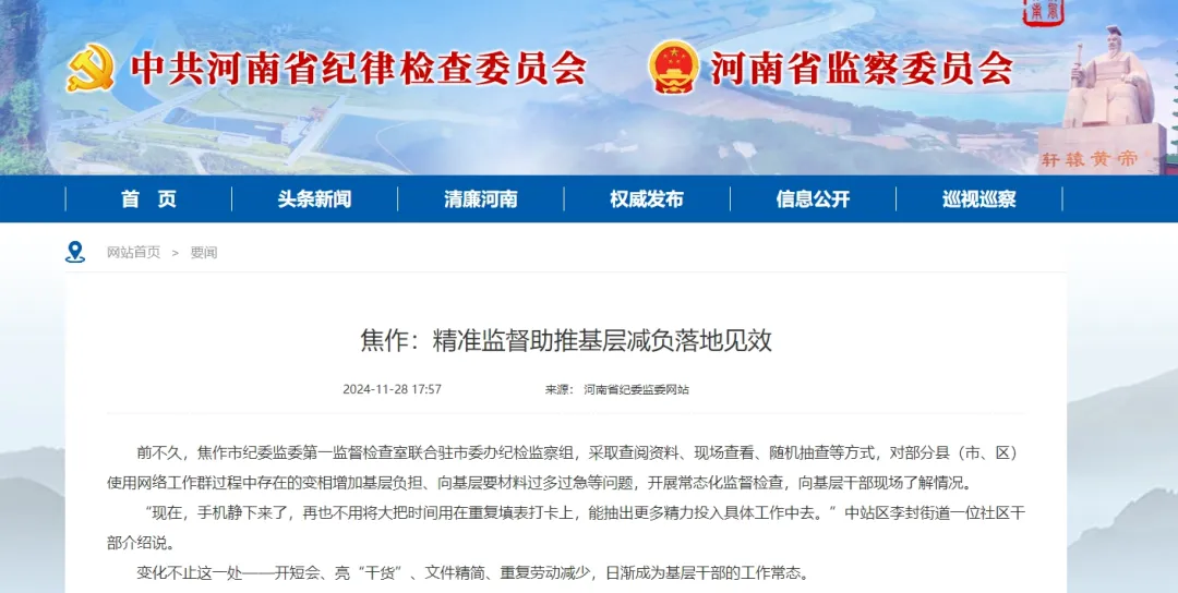 今年以来,焦作市纪委监委立足职能职责,将整治形式主义为基层减负作为重点任务,紧盯“指尖上的形式主义”“滥挂牌”等加强监督检查,持续解决困扰基层的难点问题,让基层干部从文山会海、冗杂事务中解脱出来,监督保障基层减负工作深入推进。