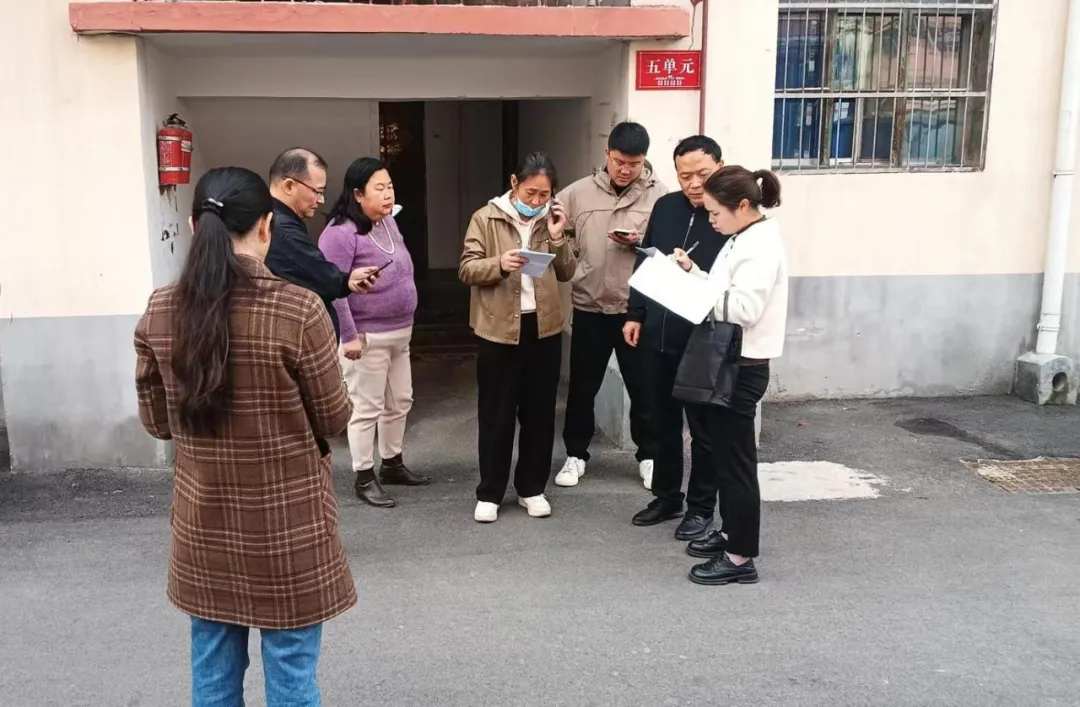 解放区纪委监委工作人员到民主街道省建二公司家属楼,向群众走访了解在老旧小区改造过程中存在的问题。(吴素丽 摄)