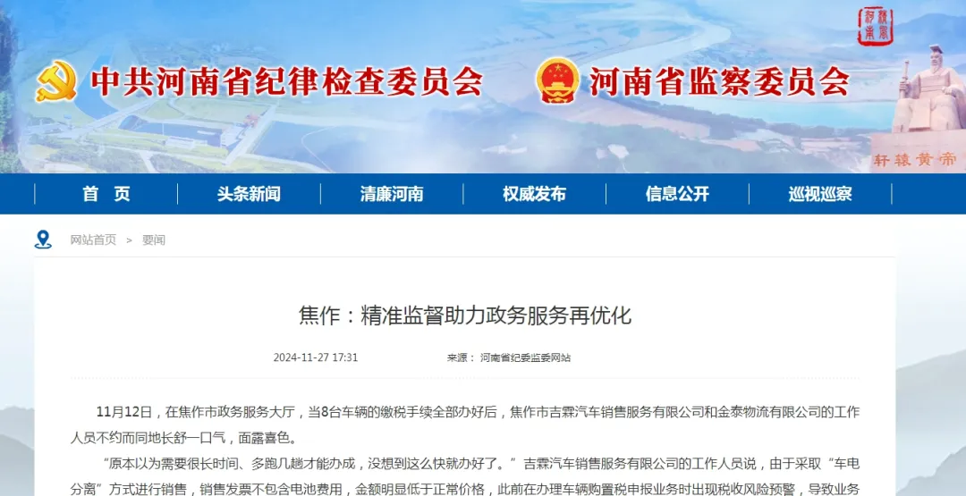 11月12日,在焦作市政务服务大厅,当8台车辆的缴税手续全部办好后,焦作市吉霖汽车销售服务有限公司和金泰物流有限公司的工作人员不约而同地长舒一口气,面露喜色。