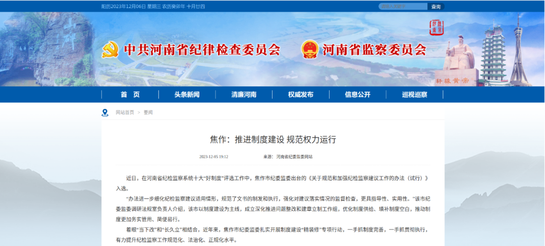 “我们将把制度建设和执行贯穿纪检监察工作各方面、全过程,发挥好法规制度规范流程、提高效率、防范风险作用,确保纪检监察权力严格规范行使。”焦作市纪委监委相关负责人表示。