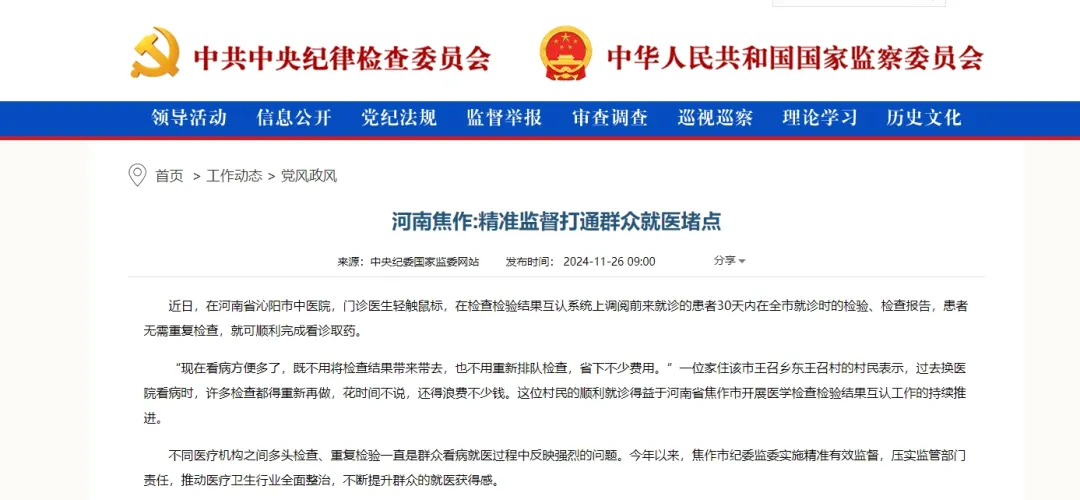 不同医疗机构之间多头检查、重复检验一直是群众看病就医过程中反映强烈的问题。今年以来,焦作市纪委监委实施精准有效监督,压实监管部门责任,推动医疗卫生行业全面整治,不断提升群众的就医获得感。
