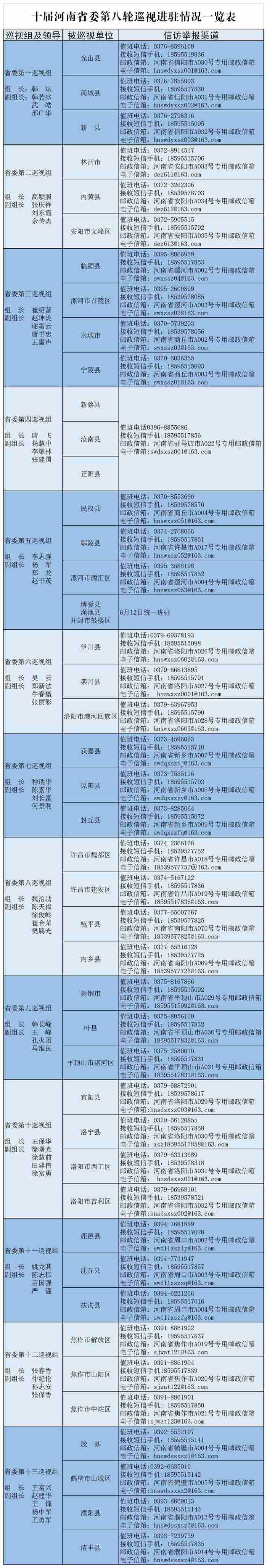 据了解,河南省委巡视组计划于7月10日前撤回,现场巡视时间2个月。巡视期间设专门值班电话、邮政信箱、电子邮箱、接收短信手机和联系信箱,主要受理反映被巡视党组织领导班子及其成员、下一级党组织领导班子主要负责人和重要岗位领导干部问题的来信来电来访。