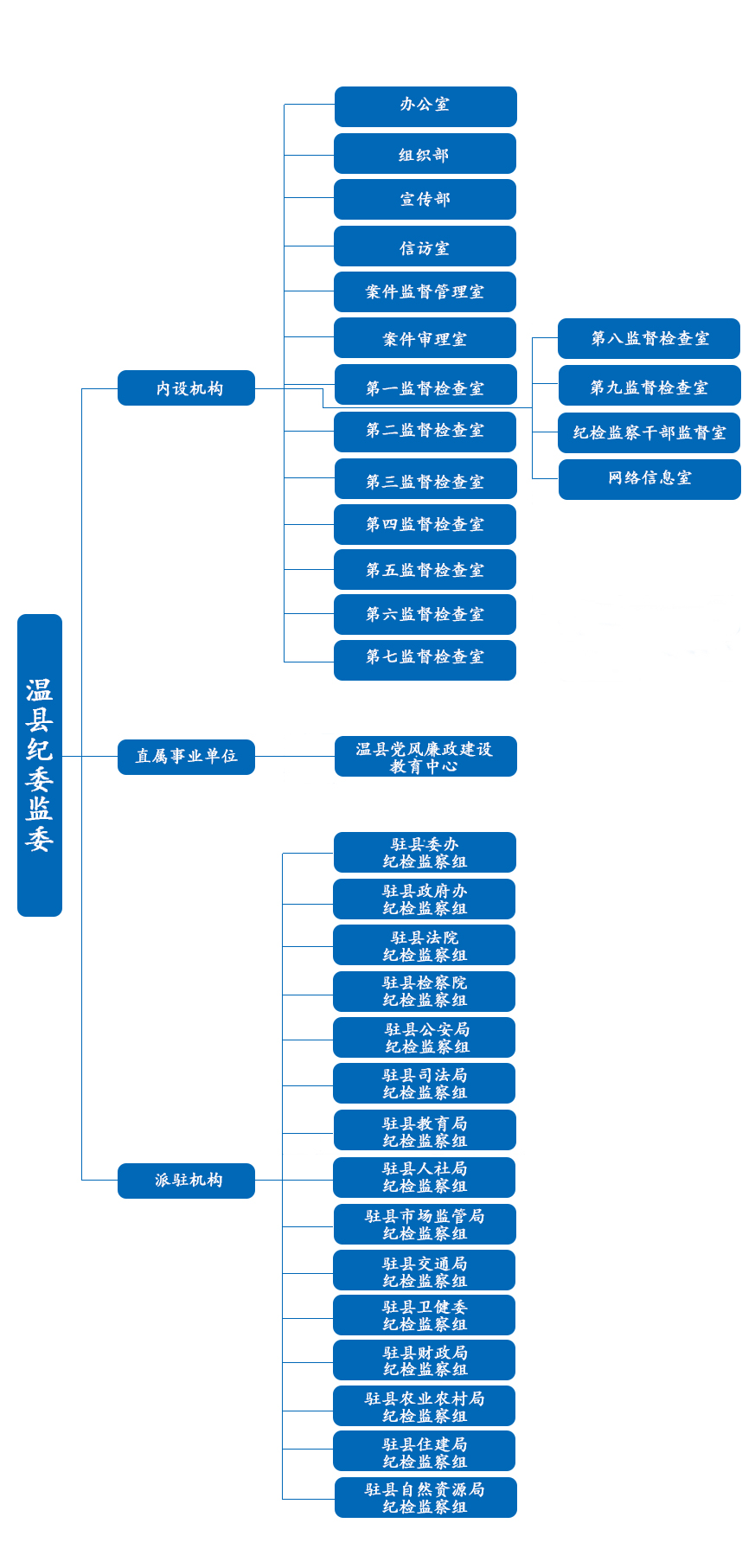 温县纪委机关与温县监察委合署办公,共有17个内设机构,分别为:办公室、组织部、宣传部、信访室、案件监督管理室、案件审理室、第一纪检监察室、第二至第九纪检监察室、纪检监察干部监督室、网络信息室。下属1个事业单位:温县党风廉政建设教育中心。实行统一管理的派驻机构15个,分别是:派驻县委办纪检监察组、派驻县政府办纪检监察组、派驻县法院纪检监察组、县检察院纪检监察组、派驻县公安局纪检监察组、派驻县司法局纪检监察组、派驻县教育局纪检监察组、派驻县人社局纪检监察组、派驻县市场监管局纪检监察组、派驻县交通局纪检监察组、派驻县卫健委纪检监察组、派驻县财政局纪检监察组、派驻县农业农村局纪检监察组、委派驻县住建局纪检监察组、委派驻县自然资源局纪检监察组。