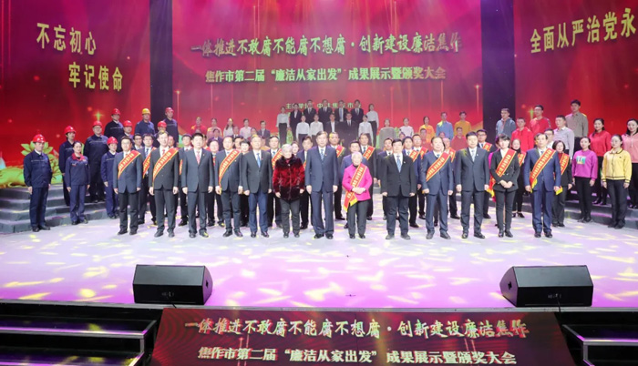 由市委主办,市纪委监委、市委宣传部承办的“一体推进不敢腐不能腐不想腐·创新建设廉洁焦作第二届‘廉洁从家出发’成果展示暨颁奖大会”,1月8日晚在焦作广播电视台一号演播厅举行。市委书记王小平为廉洁社会治理创新奖获得者颁奖,市委副书记、市长徐衣显为廉洁组织管理创新奖获得者颁奖,省纪委监委宣传部长袁勇为廉洁家庭建设创新奖获得者颁奖。