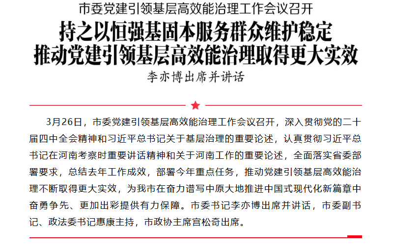 市委党建引领基层高效能治理工作会议召开 持之以恒强基固本服务群众维护稳定 推动党建引领基层高效能治理取得更大实效 李亦博出席并讲话
